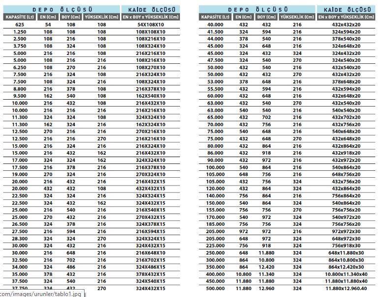 Kapasite Aralığı : 1 -2000 M3 Malzeme : (AISI 304) Paslanmaz DAYANIKLILIK Modüller yüksek basınçlı preslerde soğuk şekillendirme ile mukavemet kazandırılır. HİJYEN Modüler depoların bütün parçaları hijyen koşullarına uygun olarak üretilir. Paslanmaz ( AISI 304) depo içinde hiçbir şekilde yosun ve bakteri oluşmaz. BAKIM VE ONARIM Bakım ve onarımı çok kolaydır. Gerektiğinde parçalar birbirinden bağımsız olarak değiştirilebilir.