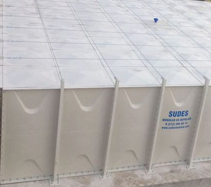 Kapasite Aralığı 1-5000 m? GRP (Cam elyaf takviyeli polyester) nedir? GRP modüler su depoları, kırpılmış cam elyaf ile takviye edilmiş doymamış polyester reçineden oluşan levhaların sıcak presleme yöntemi ile yüksek basınç ve sıcaklık altında kürlenmesi yöntemi ile üretilir. Paneller yüksek tonajlı preslerde 1500C dereceye ısıtılmış kalıplarda imal edilirler. Kullanılan kalıp ve imalat teknolojisi sayesinde, üretilen panellerin her iki yüzü de pürüzsüz, tamamen kürlenmiş ve dayanıklıdır. Sudes GRP paneller tüm dünya tarafından kabul gören WRAS belgesine sahiptir. Ayrıca gıda tüzüğüne uygunluğu TSE tarafından yapılan testlerle raporlanmıştır. UV ışınlarına karşı dayanıklıdır ve ışık geçirmediği için tank içinde yosun oluşmasına müsaade etmez. Termal İzolasyon: GRP Modüler depolar yüzeyi poliüretan köpük kaplanarak termal izolasyonu sağlanır. Kullanılan yalıtım malzemesi CFC ve HCFC içermez. Doğaya zarar vermez. Termal iletkenlik karşılaştırma tablosu
